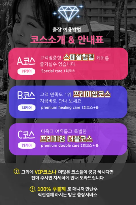 커플마사지와 싱글마사지 모두 코스별 서비스를 받아보실 수 있으며, 만취자나 상습 예약취소자, 그리고 악성 이용자 등은 예약을 사절합니다.