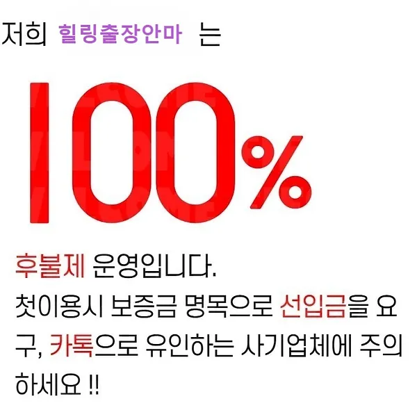 저희 S라인미와 같은 정식등록 마사지 업체들은 무조건 후불제로 서비스를 진행하고 있으며, 홈페이지나 광고에는 후불제라고 설명을 해두었으면서 고객님께서 계신 지역의 담당자를 따로 배정 해 드린다는 명목으로 카카오톡 아이디나 문자링크를 보내드리는 방식, 그리고 매니저의 프로필 사진을 보여주면서 초이스를 해서 안전금이나 예약비를 요구하는 경우라면 100% 틀림없는 사기 업체라고 생각하시면 됩니다.